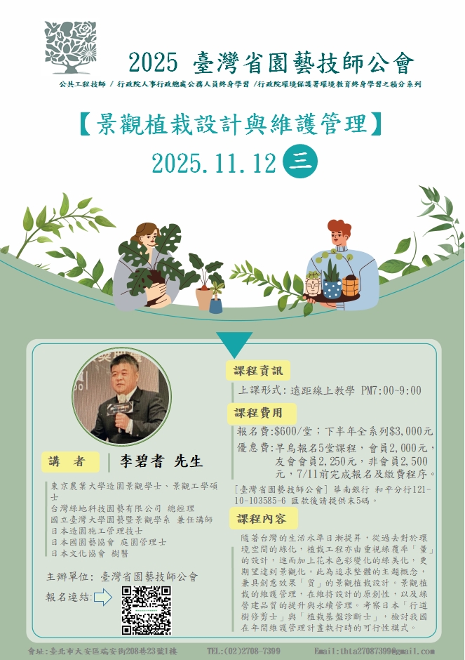 匯款帳號: [臺灣省園藝技師公會] 華南銀行 和平分行121-10-103585-6(匯款後提供末5碼,以利完成報名)。 Email: thta27087399@gmail.com 電話:02-2708-7399